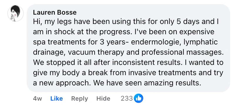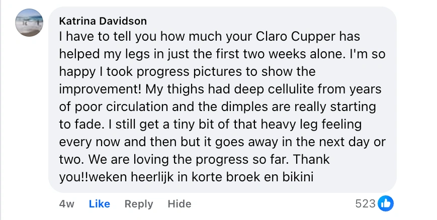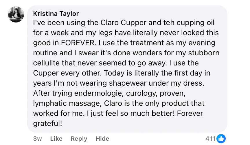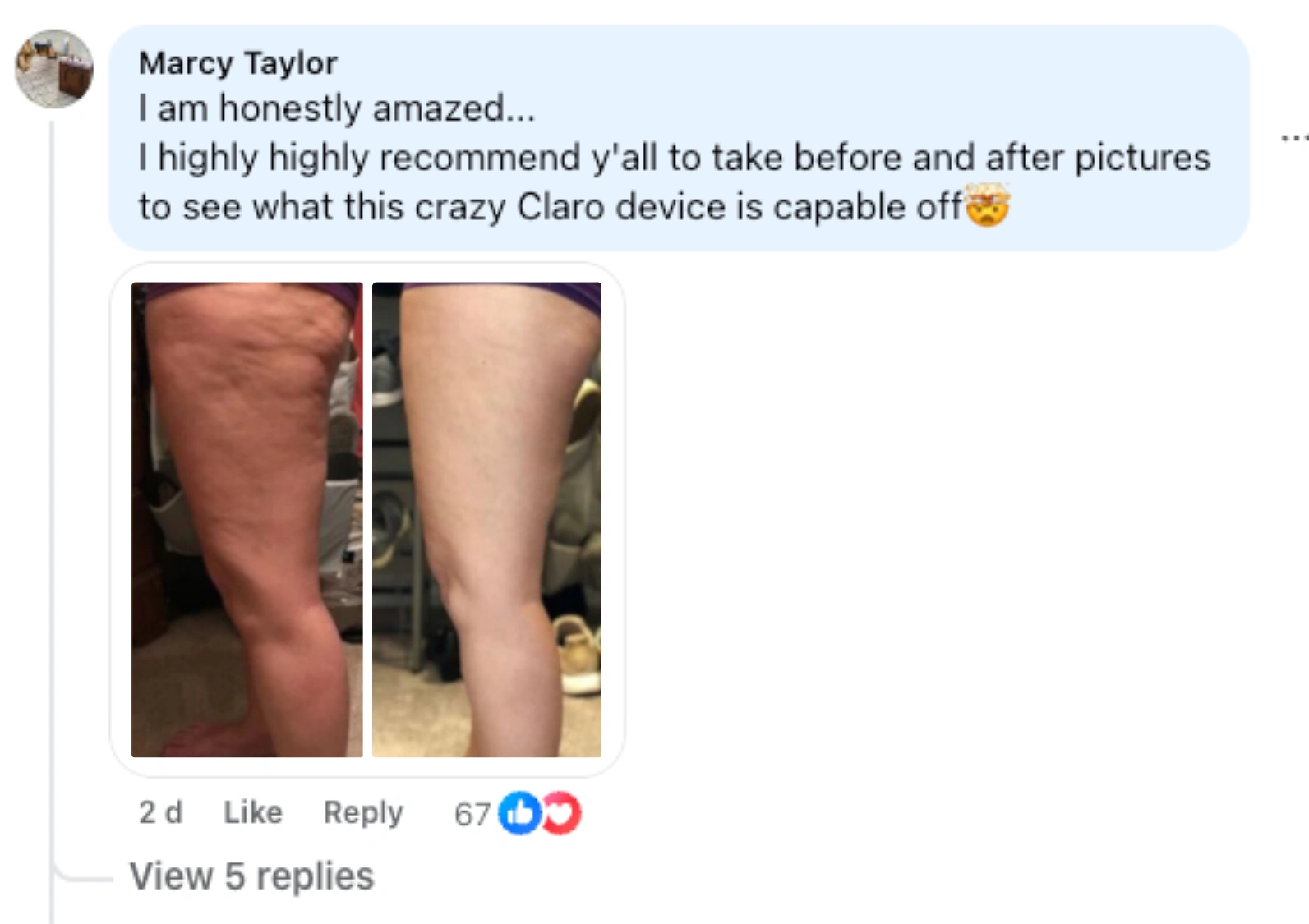 Only cellulite treatment I'd seen work before was 2500 dollar salon packages that barely lasted a month. My thighs were so dimpled I hadn′t worn shorts in 5 years and tried Claro after wasting 2500+ dollars on creams, those horrible static cups that left me black and blue, and painful treatments.